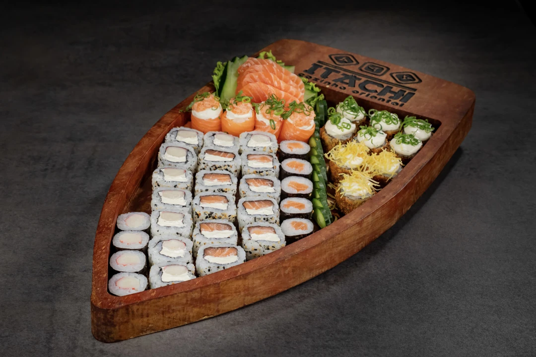 04 sashimi salmão, 04 joy salmão, 05 hossomaki salmão, 04 hossomaki kani, 09 uramaki salmão Philadelphia, 09 uramaki kani, 09 hot rolls. **Foto ilustrativa, não vai na barca**
