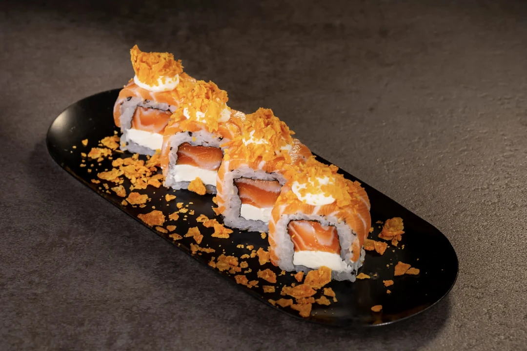 Roll de arroz e salmão envolto por alga nori frito. Cobertura a escolha.