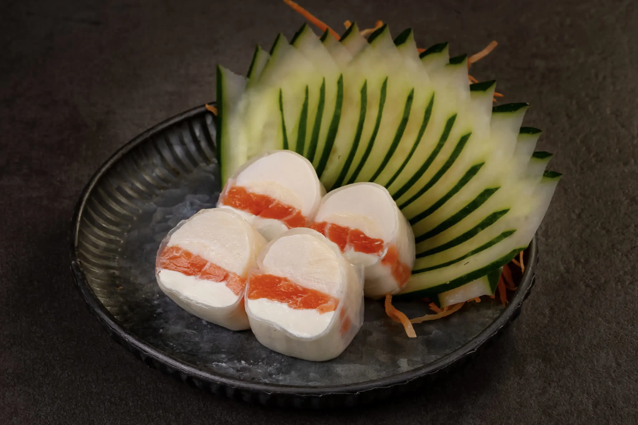 Roll de salmão, palmito e cream cheese Philadelphia envolto por folha de arroz.