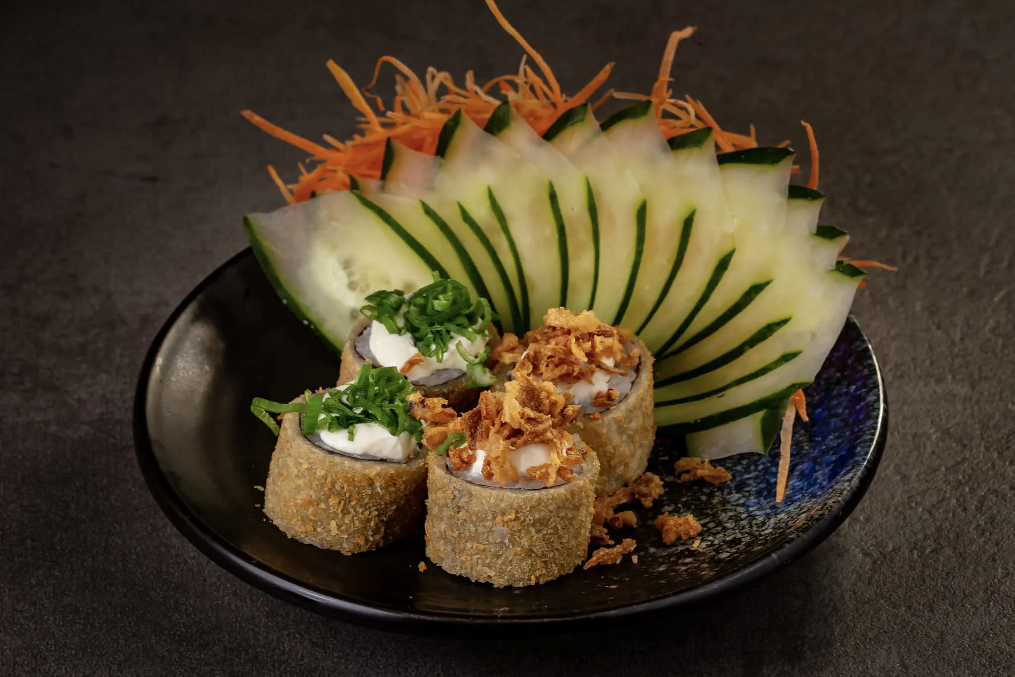 Roll de arroz e salmão envolto por alga nori frito. Cobertura a escolha.