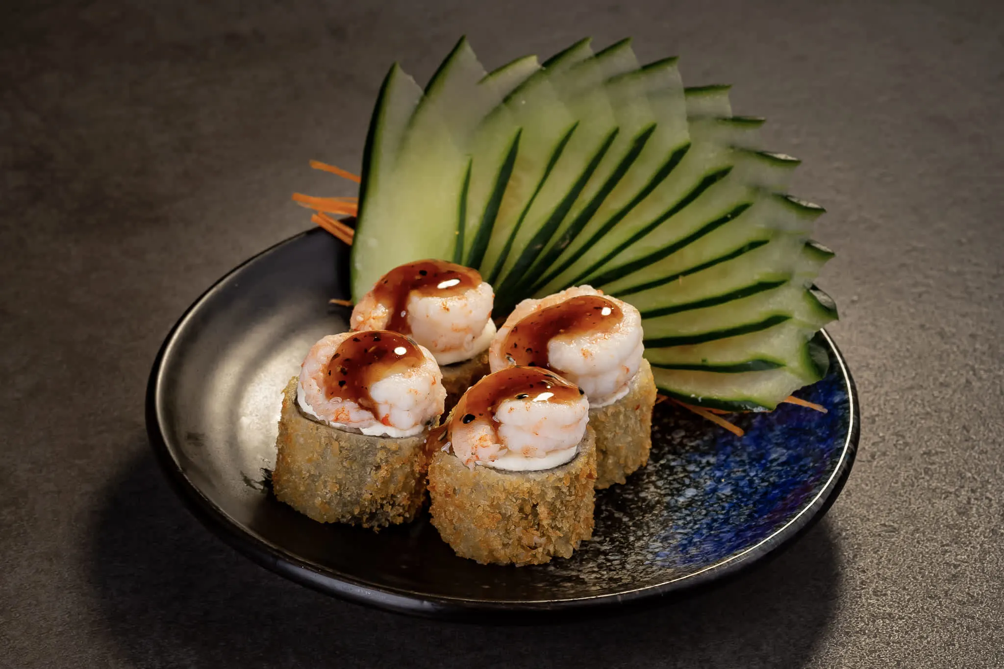 Camarão empanado em farinha Panko, envolto por uma lâmina de salmão fresco e cream cheese Philadelphia, finalizado com molho tarê, cebolinha e gergelim.