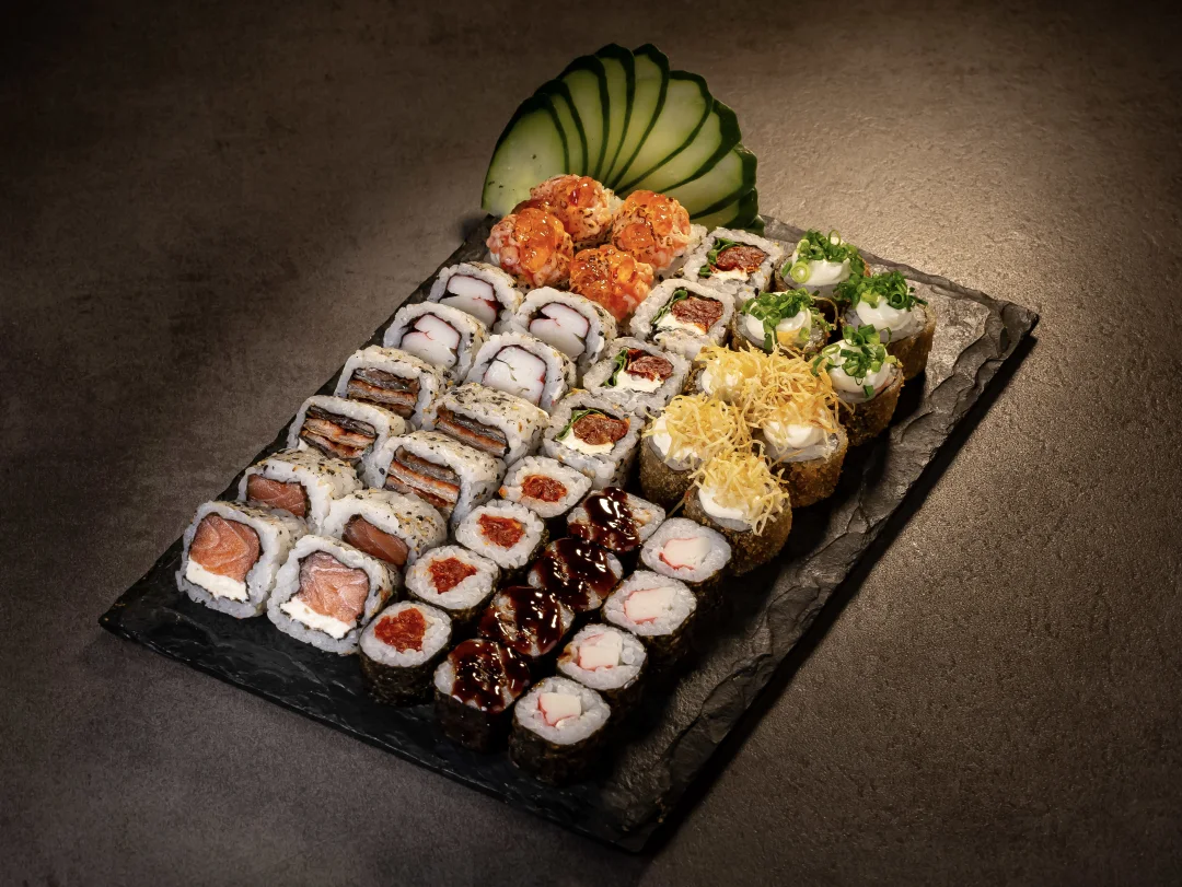 04 baterá com geleia de pimenta, 04 uramaki kani, 04 uramaki skin, 04 uramaki salmão Philadelphia, 04 uramaki tomate seco e rúcula, 04 hossomaki tomate seco, 04 hossomaki skin, 04 hossomaki kani, 08 hot roll salmão.