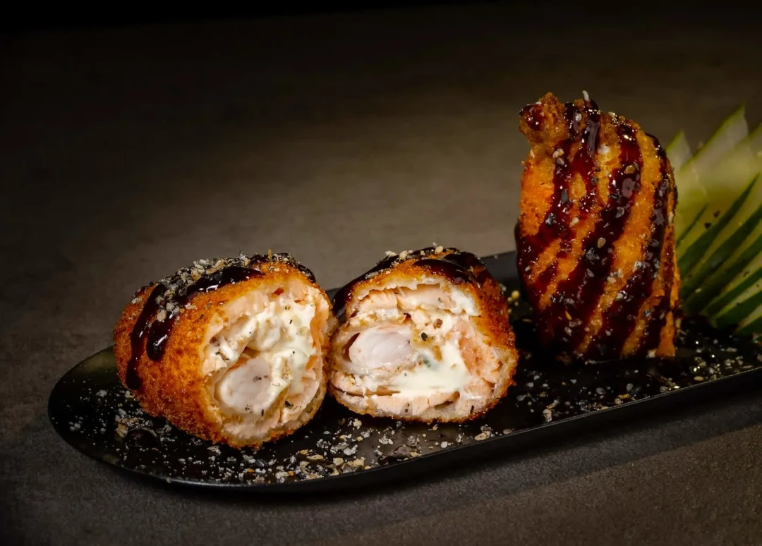 Queijo brie e cream cheese Philadelphia envoltos em lâmina de salmão, empanado e frito em farinha Panko.