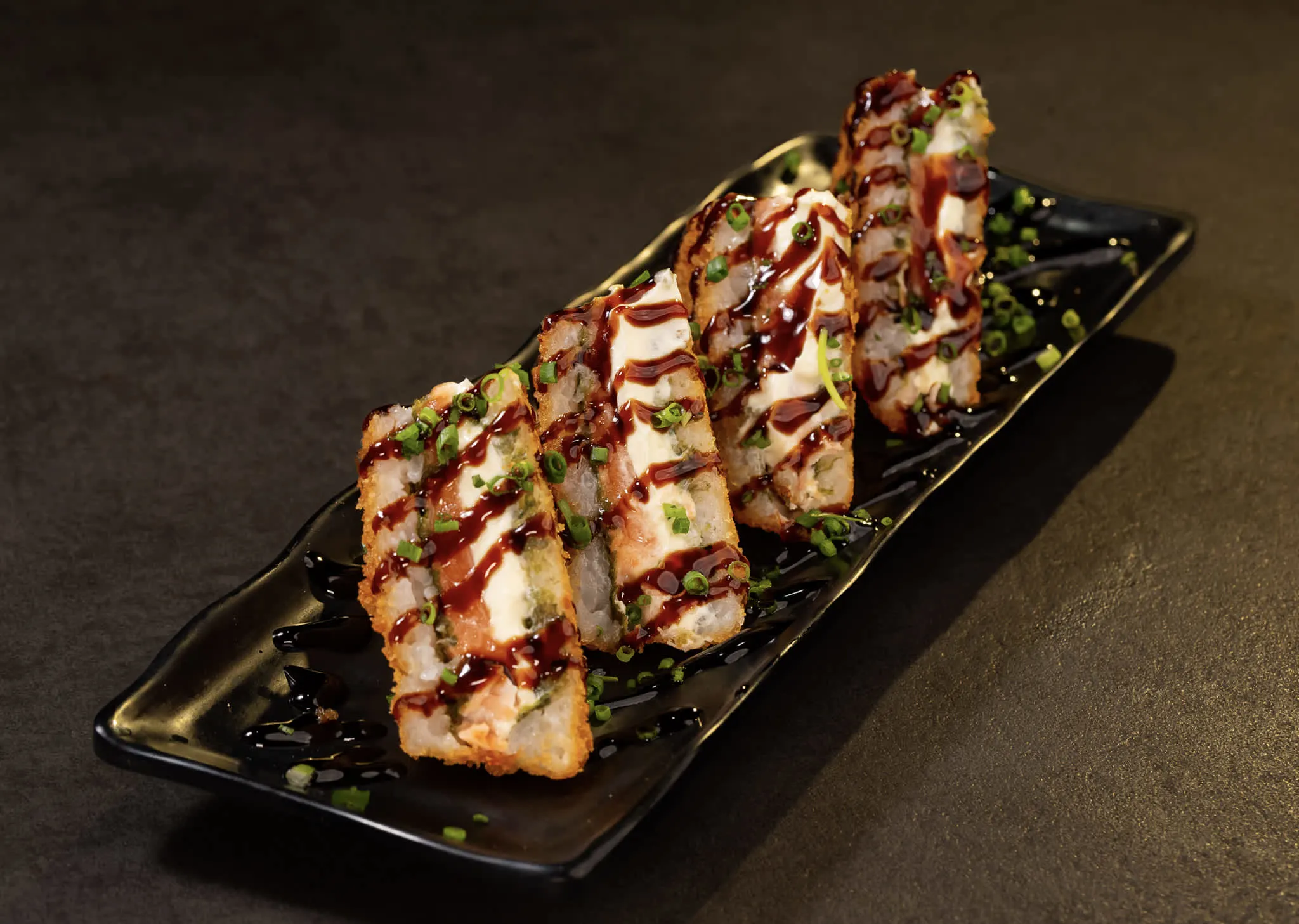 Empanado de salmão com cream cheese Philadelphia, envolto por alga nori, arroz japonês e farinha Panko, finalizado com molho tarê e cebolinha. **Aproximadamente 370g**