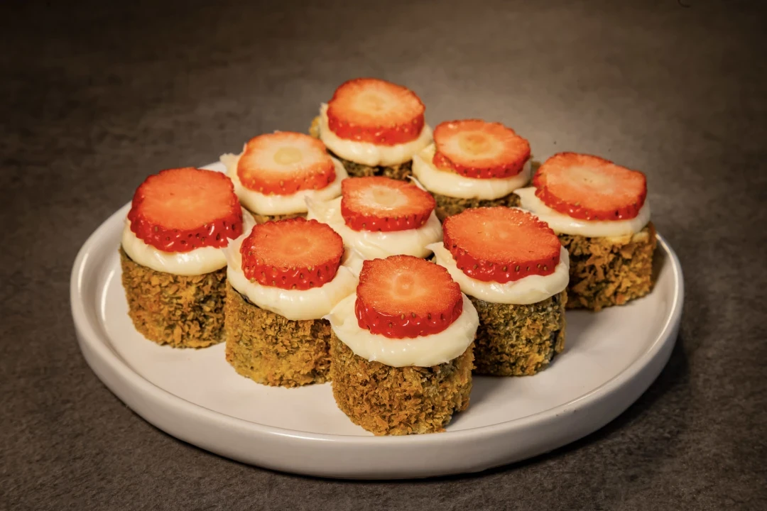 Roll de arroz e morango envolto por alga nori, frito, finalizado com chocolate branco e morango.