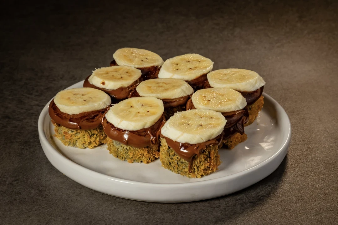 Roll de arroz e banana envolto por alga nori, frito, finalizado com Nutella e banana.