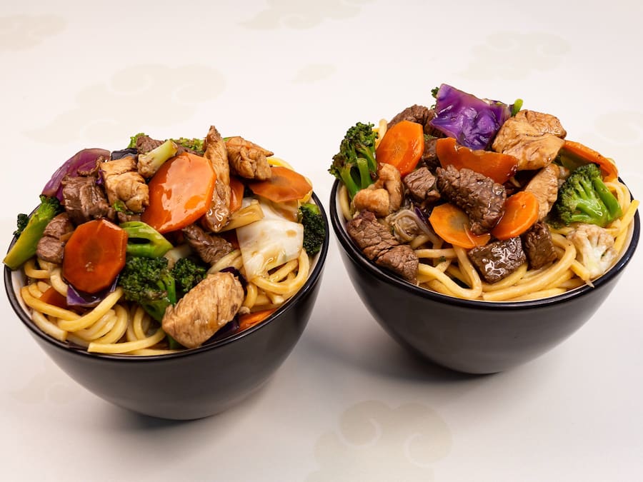 Tradicional receita oriental, feita com massa especial para yakisoba, filé mignon, filé de frango e legumes variados.