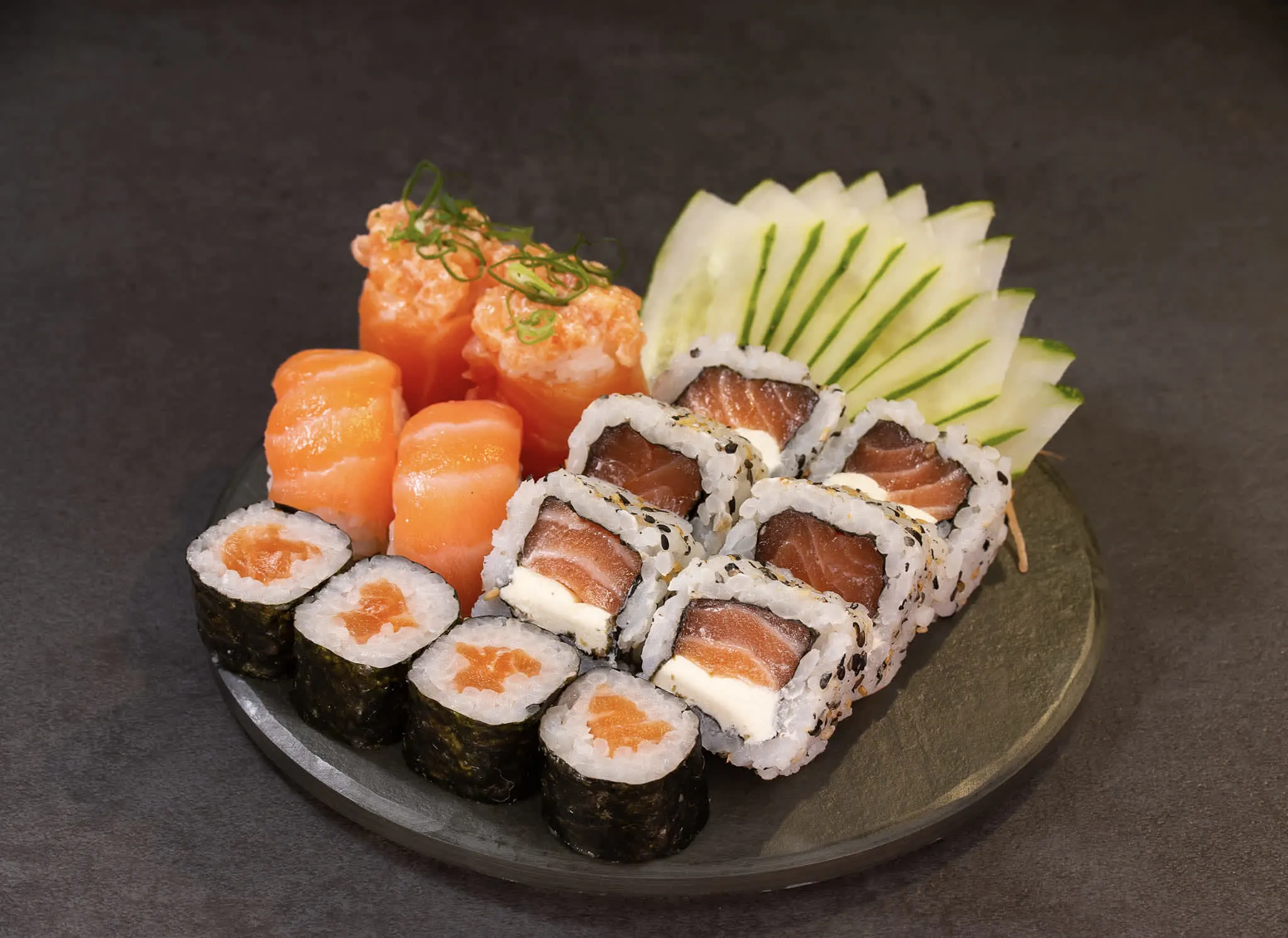 04 sashimi salmão, 04 joy salmão, 04 niguiri salmão, 08 uramaki salmão Philadelphia e 04 hossomaki salmão.